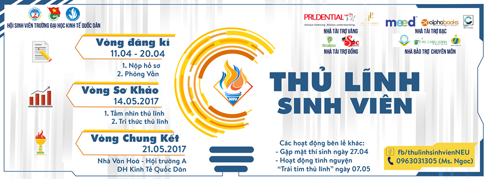 Vào hồi 18h30 ngày 21/05/2017, tại Nhà văn hóa – Hội trường A, trường Đại học Kinh tế Quốc dân đã diễn ra đêm chung kết cuộc thi THỦ LĨNH SINH VIÊN 2017. Cuộc thi là những màn tranh luận của top 10 thí sinh về các vấn đề như: khởi nghiệp trên ghế nhà trường, sinh viên nên đi làm thêm, lựa chọn nghề nghiệp tương lai, du học sinh nên định cư hay trở về, google có đang giết chết sự sáng tạo của con người. Với tư duy vô cùng sắc bén và cái nhìn đa chiều của các thủ lĩnh tương lai, các vấn đề đã được đưa ra và giải quyết vô cùng thuyết phục.