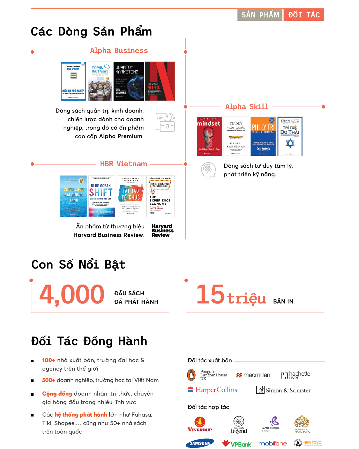 Alpha Books được biết đến là một trong những thương hiệu hàng đầu về dòng sách quản trị kinh doanh, phát triển kỹ năng, tài chính, đầu tư… với các cuốn sách hướng dẫn khởi nghiệp, các bài học, phương pháp và kinh nghiệm quản trị của các chuyên gia, và các tập đoàn nổi tiếng trên thế giới. Sau 20 năm hình thành và phát triển, Alpha Books đã từng bước khẳng định tên tuổi của mình, đặc biệt đối với các thế hệ doanh nhân, nhà quản lý và những người trẻ luôn khát khao xây dựng sự nghiệp thành công.