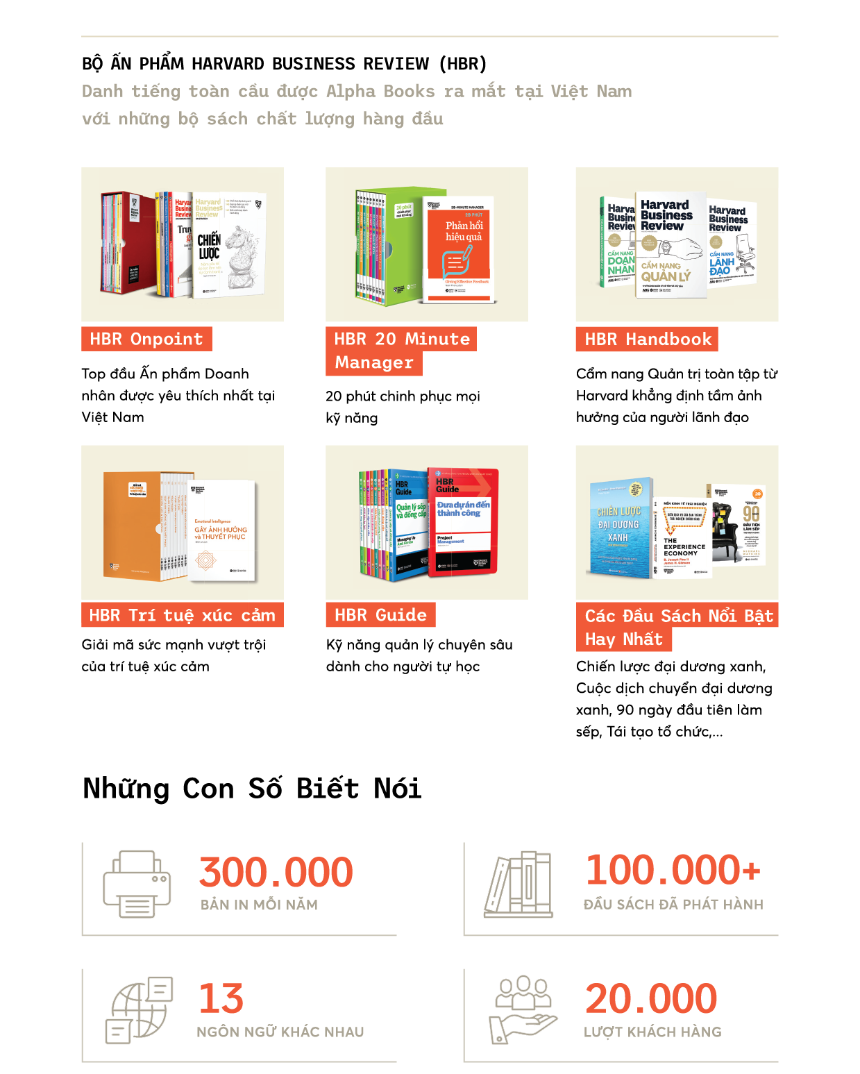 Bộ ấn phẩm Harvard Business Review (HBR) danh tiếng toàn cầu được Alpha Books “bản địa hoá" thành công và ra mắt tại Việt Nam với những bộ sách chất lượng hàng đầu, nhận được rất nhiều sự yêu thích và đón chờ từ độc giả, đặc biệt bởi Shark Nguyễn Thanh Việt, Bà Nguyễn Phương Thảo – Tổng Giám đốc Vietjet Air, Bà Hà Thu Thanh – Chủ tịch Deloitte Việt Nam, Ông Hồ Quang Minh – Chủ tịch BNI Việt Nam….