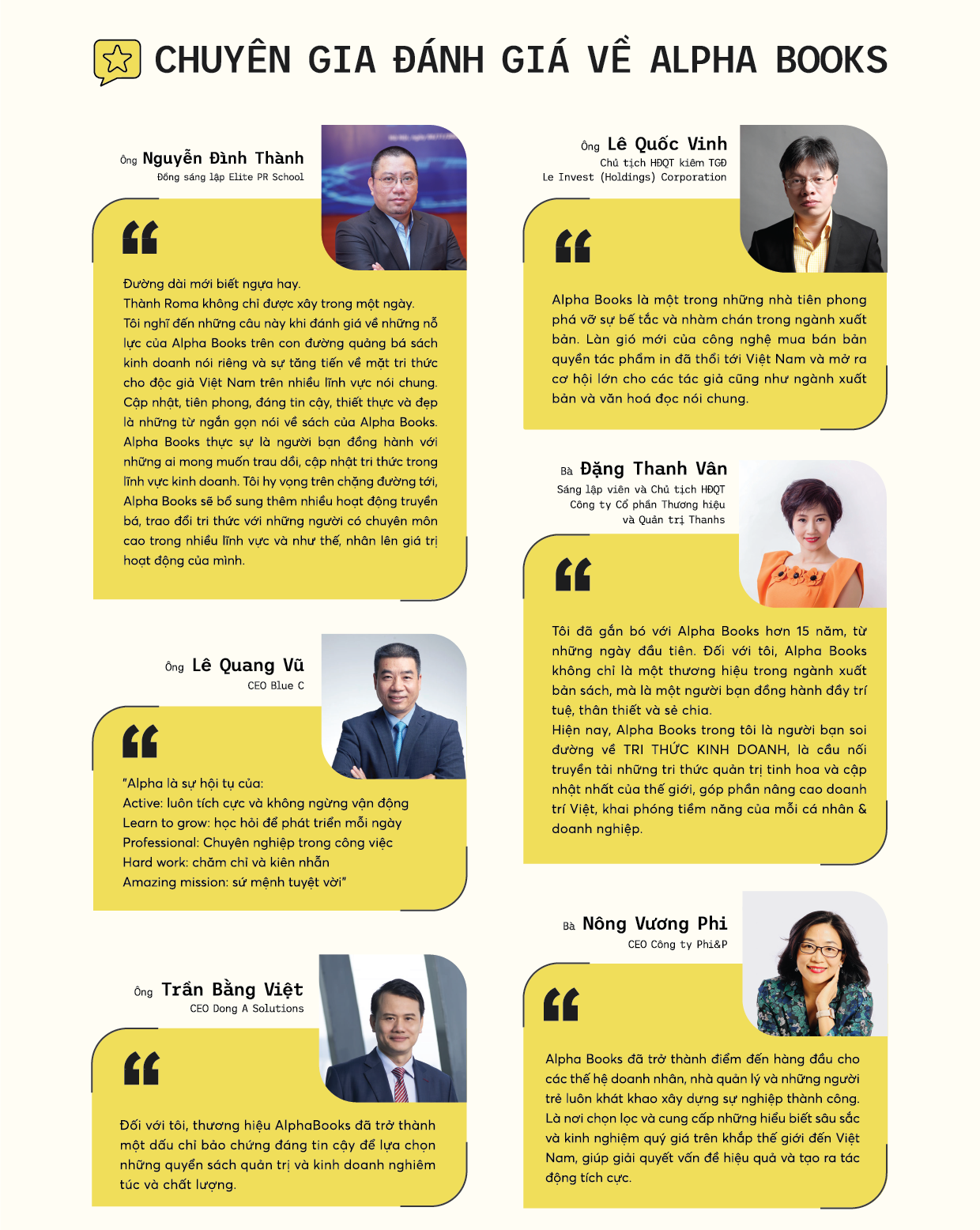 Alpha Books kỳ vọng những tri thức quản trị tinh tuyển và cập nhật sẽ đóng góp vào tư duy quản trị của các doanh nghiệp Việt Nam, khai phóng tiềm năng lãnh đạo của mỗi doanh nhân và góp phần vào sự phát triển kinh tế chung của quốc gia.