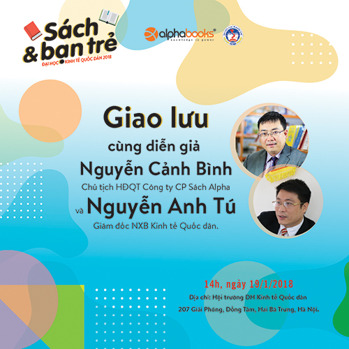 Đặc biệt, trong Hội sách còn có buổi tọa đàm của diễn giả: Ông Nguyễn Cảnh Bình – CEO Alpha Books và Ông Nguyễn Anh Tú – Giám đốc NXB Kinh tế Quốc Dân sẽ được diễn ra vào lúc 14h ngày 19/1/2018 tại Hội trường Đại học Kinh tế Quốc dân.