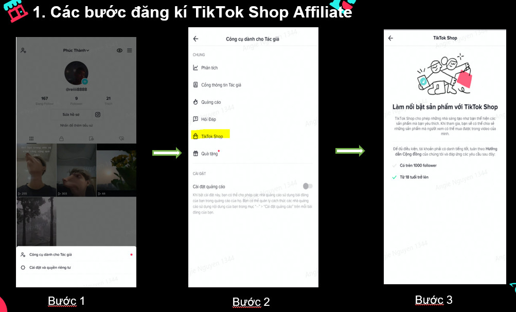 Bước 1:Đầu tiên bạn cần chuẩn bị 01 tài khoản TikTok có trên 1000 người theo dõi, TikTok sẽ tự mở khóa chức năng Affiliate cho bạn.