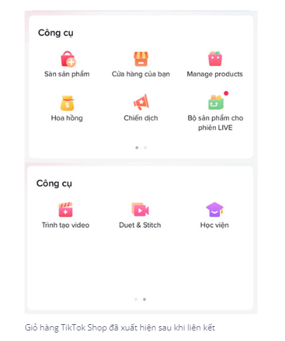 Thêm sản phẩm để làm tiếp thị liên kết TikTok Sau khi nick TikTok của bạn đã có giỏ hàng, bạn bấm vào đó và làm theo hướng dẫn để mở tài khoản tiếp thị liên kết. Phần này có khá nhiều bước nhưng rất đơn giản nên mình sẽ không hướng dẫn gây dài dòng không cần thiết. Bạn sẽ bấm vào phần Sàn sản phẩm để thêm các sản phẩm vào TikTok Shop của mình, sau khi đã thêm được sản phẩm thì lúc đăng video mới có thể gắn sản phẩm vào. Công cụ