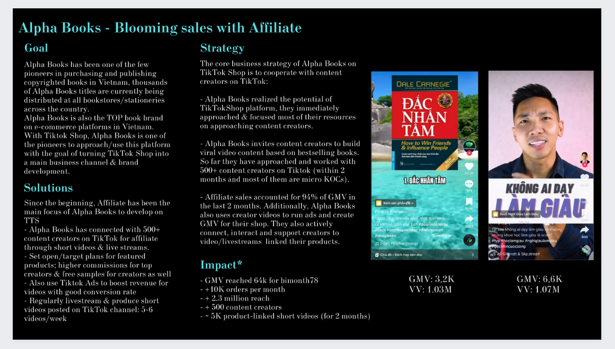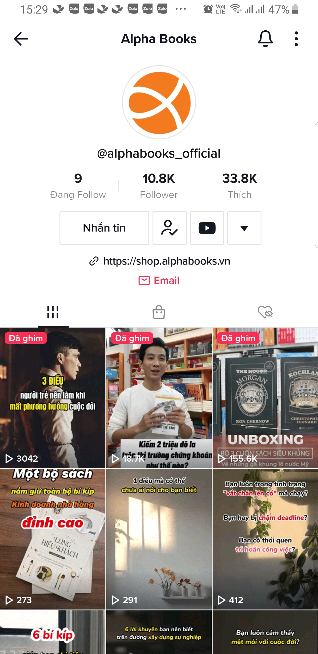 (lấy ảnh chính thức của titkok thay vào sau) Alpha Books hiện có 2 shop chính thức trên Tiktok là Alpha Books và Alpha Books HCM , với hơn 5000 Creator đang hợp tác gắn link Affilliate, và sẽ còn phát triển số lượng nhiều hơn nữa