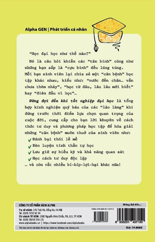 Đừng Đợi Đến Khi Tốt Nghiệp Đại Học sẽ giúp bạn sử dụng những năm tháng sinh viên của mình một cách thông minh nhất. Cuốn sách là tổng hợp những chia sẻ kinh nghiệm quý báu của các thế hệ sinh viên đi trước về các bước ngoặt lớn như lựa chọn chuyên ngành, học thêm hay làm thêm, học thạc sỹ hay đi làm ngay, đi làm nhà nước hay tư nhân… Cùng với đó là những lời khuyên hữu ích về phương pháp học tập, tư duy và phong cách sống. Từ những điều tưởng chừng như rất nhỏ nhặt như đánh bại bệnh trì hoãn, rèn luyện thể chất cho tới những bí kíp thiết thực như chọn sách thế nào, viết luận văn ra sao… - sẽ giúp bạn tránh được những “căn bệnh” muôn thuở của sinh viên.