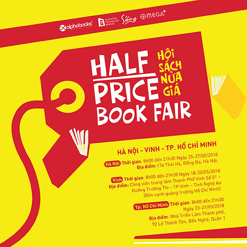 Lần đầu tiên Alpha Books cùng tổ chức HỘI SÁCH NỬA GIÁ – HALF-PRICE BOOK FAIR tại BA MIỀN HÀ NỘI – VINH – TP. HỒ CHÍ MINH. Với mong muốn bạn đọc trên khắp dải đất Việt Nam được tiếp cận gần hơn với tri thức, Alpha Books quyết định lan rộng Hội sách Nửa Giá trên khắp các tỉnh thành. Đến với Hội sách bạn đọc sẽ được mua rất nhiều cuốn sách hay với mức chiết khấu lớn.