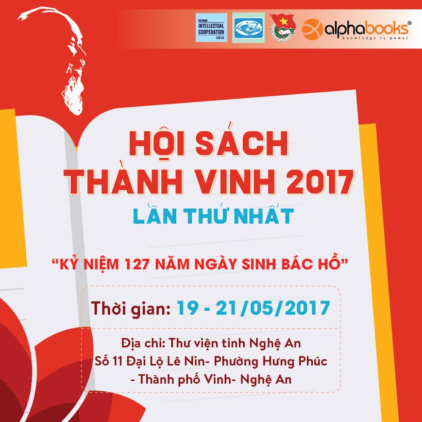 Cùng cả nước hướng đến kỷ niệm 127 ngày sinh chủ tịch Hồ Chí Minh cùng với việc nêu cao tinh thân học tập không ngừng nghỉ của Bác trong quần chúng nhân dân , AphaBooks phối hợp cùng tỉnh đoàn Nghệ An, thư viện tỉnh Nghệ An và công ty VICC tổ chức “ HỘI SÁCH THÀNH VINH 2017 ”- nơi bạn có thể thỏa sức mua vô vàn các đầu sách hay của AlphaBooks và các công ty phát hành sách uy tín khác, tại Thư viện tỉnh Nghệ An từ ngày 19/05/2017 đến hết ngày 21/5/2017.