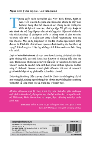 Luật trí não dành cho trẻ sẽ vượt qua được khoảng cách/ sự khác biệt giữa những điều các nhà khoa học khuyên và những điều cha mẹ làm. Thông qua những câu chuyện hấp dẫn và vui nhộn, Medina với tư cách là cha đẻ của bộ môn sinh học phân tử thực nghiệm, đã làm sáng tỏ cách não bộ của trẻ nhỏ phát triển như thế nào và làm cách gì để có thể đạt tới sự phát triển toàn diện cho trẻ.