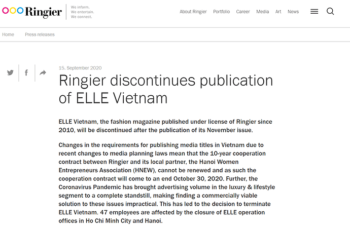 Nói chung cũng từng gắn bó nhiều năm tại tập đoàn Ringier với nhiều vai trò khác nhau và mình cũng còn người quen làm việc tại ELLE nên có liên hệ để hỏi thăm. Mình giúp thông tin lại một số nội dung mà theo mình là những gì người trong cuộc biết để mọi người nắm vì ELLE hiện cũng có nhiều đối tác và khách hàng trên thị trường và thông báo phía trên có thể gây vài hiểu lầm không đáng có.